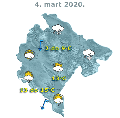 U južnim i centralnim predjelima Crne Gore danas će biti promjenljivo oblačno, uz uslove za mjestimično povremenu kišu, prijepodne se očekuje više oblačnosti, a poslijepodne sunčani intervali. Na sjeveru umjereno do pretežno oblačno, povremeno sa susnježicom i snijegom, a u nižim predjelima kišom i snijegom. Vjetar slab do umjeren promjenljivog smjera, poslijepodne i tokom noći mjestimično umjeren do pojačan sjeverni i sjeveroistočni. Najviša dnevna temperatura vazduha od dva do 15 stepeni, saopšteno je iz Zavoda za hidrometeorologiju.