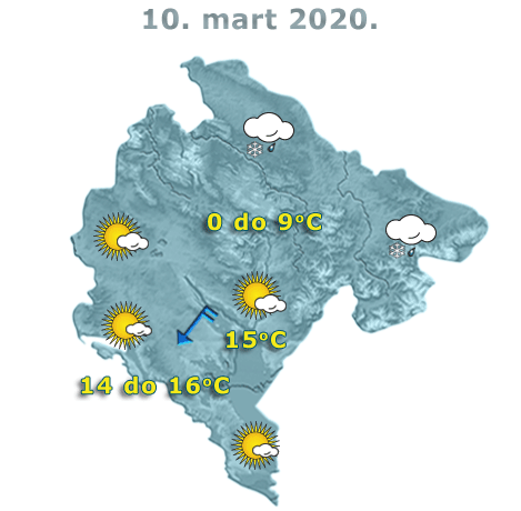 U južnim i centralnim predjelima Crne Gore danas će biti pretežno ili djelimično sunčano. Na sjeveru umjereno do potpuno oblačno, povremeno sa uglavnom slabim snijegom i susnježicom, a ponegdje i kišom. Vjetar mjestimično umjeren do pojačan, sjevernih smjerova, od sredine dana u slabljenju. Najviša dnevna temperatura vazduha od 0 do 16 stepeni, saopšteno je iz Zavoda za hidrometeorologiju.