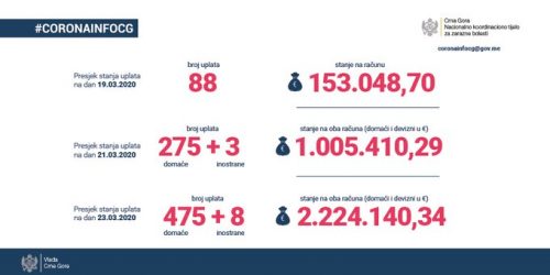 NaslovnicaDRUŠTVOVLADA CG: U manje od pet dana uplaćeno više od dva miliona... DRUŠTVOPREPORUKA VLADA CG: U manje od pet dana uplaćeno više od dva miliona pomoći 23.03.2020. u 19:56 Dijeliti FacebookTwitterPinterestWhatsApp Građani i kompanije udruženo su uplatile do više od dva miliona pomoći za manje od pet dana, upravo je saopšteno iz Vlade Crne Gore. Tagsdonacijevlada crne gore Dijeliti FacebookTwitterPinterestWhatsApp Prethodni članakSRBIJA: Treća žrtva korona virusa, počinje masovno testiranjeNaredni članakIJZ: Još pet osoba pozitivno na koronavirus u Crnoj Gori POVEZANI TEKSTOVI DRUŠTVO SAVIN KUK: Nakon nesreće troje turista uspješno evakuisano 20.12.2025. u 18:27 DRUŠTVO UPRAVA POLICIJE: Dojava o bombi u tržnom centru u Podgorici bila lažna 20.12.2025. u 17:19 DRUŠTVO NESREĆA NA SAVINOM KUKU: Poginuo turista nakon pada iz korpe 20.12.2025. u 15:18 POPULARNO SAVIN KUK: Nakon nesreće troje turista uspješno evakuisano 20.12.2025. u 18:27 UPRAVA POLICIJE: Dojava o bombi u tržnom centru u Podgorici bila lažna 20.12.2025. u 17:19 NESREĆA NA SAVINOM KUKU: Poginuo turista nakon pada iz korpe 20.12.2025. u 15:18 PODGORICA: Policija provjerava dojavu o bombi u tržnom centru 20.12.2025. u 15:14 Učitati više