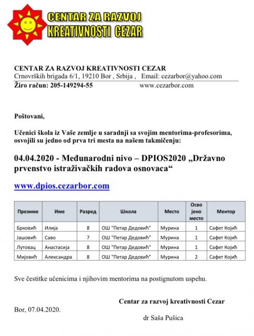 Na takmičenju Međunarodni nivo – DPIOS2020 „Državno prvenstvo istraživačkih radova“ učenici Savo Jašović, Anastasija Lutovac, Ilija Brković i Aleksandra Mijović sa svojim mentorom Safetom Kojićem iz OŠ „Petar Dedović“ iz Murine ostvarili su izuzetan uspjeh, saopšteno je iz OŠ ,,Petar Dedović”.