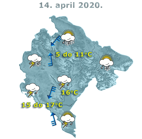 U Crnoj Gori danas će biti pretežno oblačno, prijepodne ponegdje malo kiše, poslijepodne i u večernjim satima u većem dijelu zemlje umjerene do jake padavine, ponegdje praćene grmljavinom. U sjevernim predjelima poslijepodne i krajem dana kiša će postepeno preći u snijeg, koji će se u večernjim satima proširiti ponegdje i na centralne predjele. Tokom noći prestanak padavina u cijeloj zemlji.