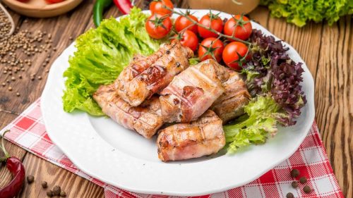 3.Urolajte šnicle, pričvrstite čačkalicama ili koncem. Prelijte šnicle bijelim vinom.