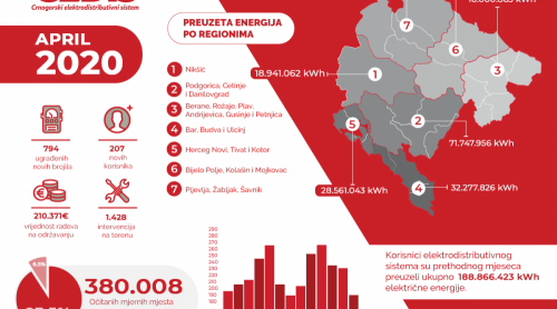 Korisnici elektrodistributivnog sistema su u aprilu preuzeli ukupno 188.866.423 kWh električne energije, što je za oko četiri odsto manje u odnosu na isti period prošle godine i za 18 odsto manje u odnosu na martovsku potrošnju. Najviše električne energije, oko 38 odsto, distribuirano je korisnicima na području Podgorice, Danilovgrada i Cetinja (Region 2), saopštli su iz Crnogorskog elektro-distributivnog sistema (CEDIS).