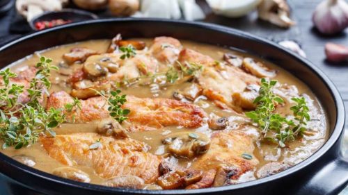 4.Postepeno sipajte vino, supu, pa brendi. Vratite piletinu i slaninu u šerpu. Dodajte timijan, posolite i pobiberite i ostavite da proključa.