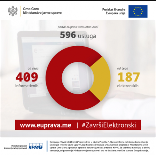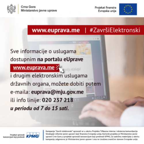 Kako je saopšteno iz MJU, na portalu eUprave (www.euprava.me) dostupni su brojni elektronski servisi državnih organa i korisne informacije o uslugama koje se mogu ostvariti od kuće, bez direktnog kontakta i odlaska na šalter, a sajt je prilagođen i za korišćenje putem mobilnih telefona.
