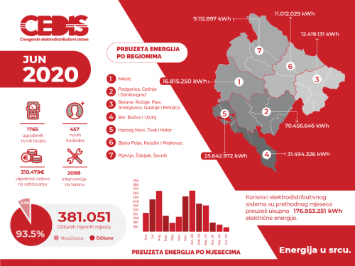 Korisnici elektrodistributivnog sistema su u junu preuzeli ukupno 176.953.251 kWh električne energije, što je za oko 18 odsto manje u odnosu na isti period prošle godine i na nivou potrošnje ostvarene tokom maja, saopšteno je iz CEDIS-a.