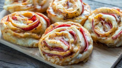 Rastopite kvasac u mlakom mlijeku, dodajte šećer i ostavite da zapjeni. Dodajte jaje i umutite žicom.Ubacite malo ulja i dodajte brašna da bude srednje tvrdo, više mekše tijesto. Dobro obradite rukama i pokrijte da se udvostruči. Razvijte tijesto u pravougaonik 1,5 cm. Premažite sirom, pa poređajte salamu, preko sipajte kečap, pa kačkavalj i ponovo malo kečapa. Ubacite i rendanu šunku nekoliko kašika. Na kraju dodajte origano. Uvijte u rolat i sijecite dva centimetra debljine. Ređajte u podmazan pleh i premažite žumancetom. Ostavite da odmara dok se rerna ugrije na 200°C. Stavite u rernu i smanjite na 180°C i pecite da porumeni oko 25-30 min. Pokrijte vruće rolnice krpom da malo odmore.