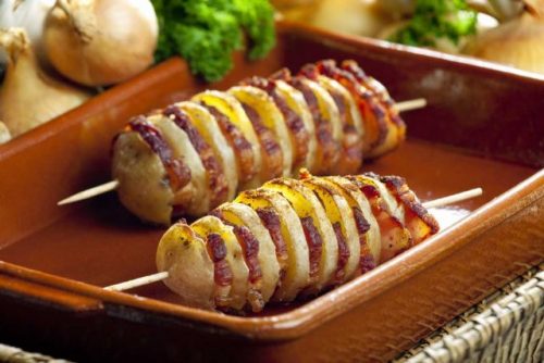 3. Ređati na čačkalicu za ražnjiće, kolut krompira, zatim parče slanine, pa ponovo krompir i tako redom. Vodite računa da kolutove ređate po redu, jer će tako ražnjić zadržati oblik krompira i izgledati interesantnije.