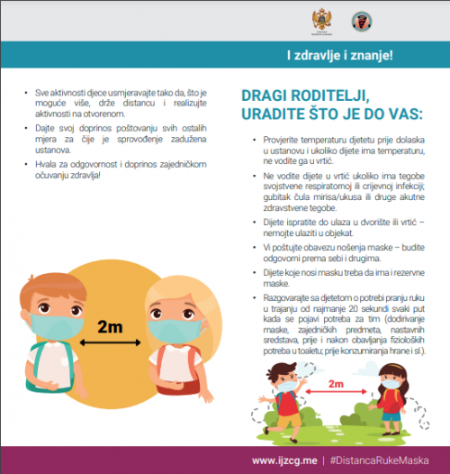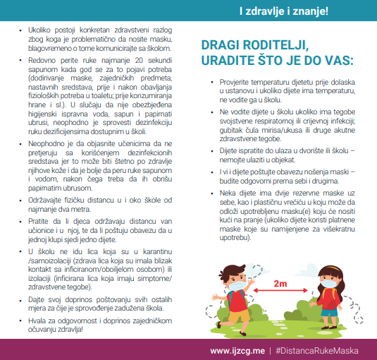 Ovo su informacije za nastavnike, učenike i roditelje kako bi se na vrijeme upoznali sa detaljima boravka u školi, ali i načinom, kako kažu iz Ministarstva prosvjete, ,,na koji treba da čuvamo svoje zdravlje van škole”.