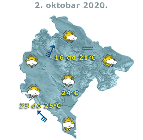 U Crnoj Gori danas će biti promjenljivo oblačno sa sunčanim intervalima. Povremeno i mjestimično se očekuje i kiša ili pljusak sa grmljavinom, naročito u drugom dijelu dana i tokom noći. Na sjeveru, ujutru po kotlinama magla i uglavnom suvo ili ponegdje uz malo kiše. Vjetar umjeren do jak južnih smjerova. Najviša dnevna temperatura vazduha od 16 do 25 stepeni, saopšteno je iz Zavoda za hidrometeorologiju.