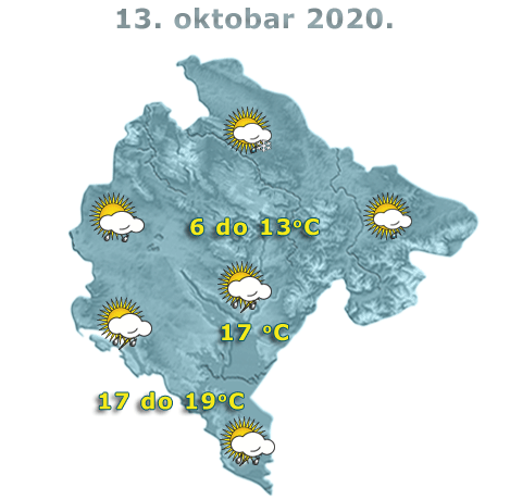 U Crnoj Gori danas će biti promjenljivo do pretežno oblačno, mjestimično kiša ili pljusak i grmljavina. Više uslova za padavine tokom prvog dijela dana. U višim planinskim predjelima, na sjeveru, susnježica i snijeg, prvenstveno u jutarnjim satima. Vjetar slab do umjeren, ponegdje i pojačan, južnih a na primorju zapadnih smjerova. Najviša dnevna temperatura vazduha od šest do 19 stepeni, saopšteno je iz Zavoda za hidrometeorologiju.