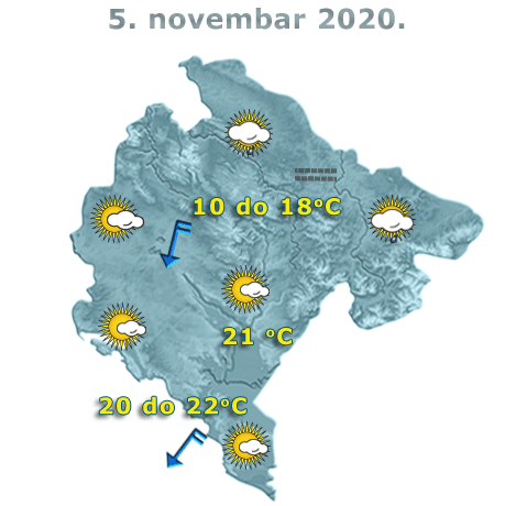 U južnim i centralnim predjelima Crne Gore danas će biti promjenljivo oblačno sa sunčanim intervalima i uglavnom suvo, a na sjeveru umjereno do pretežno oblačno, povremeno sa slabom kišom. Vjetar slab do umjeren, u drugom dijelu dana mjestimično pojačan i jak, sjevernih smjerova. Najviša dnevna temperatura vazduha od 10 do 22 stepena, saopšteno je iz Zavoda za hidrometeorologiju.