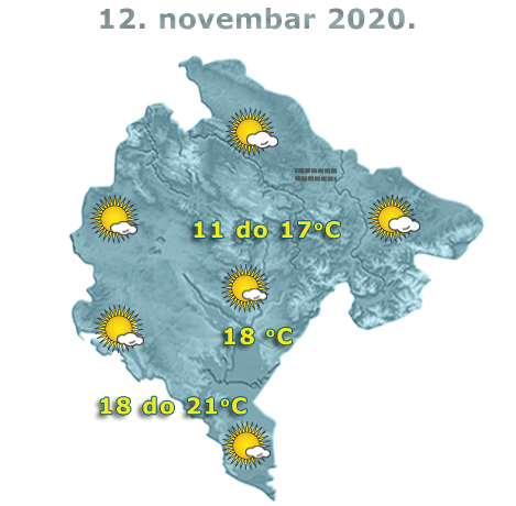 U Crnoj Gori danas će biti pretežno sunčano ili malo do umjereno oblačno, krajem dana postepeno povećanje oblačnosti. Na sjeveru ujutru ili prijepodne po kotlinama magla i sumaglica. Vjetar slab do umjeren, promjenljivog smjera. Najviša dnevna temperatura vazduha od 11 do 21 stepen, saopšteno je iz Zavoda za hidrometeorologiju.