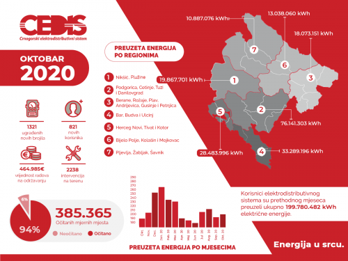 Korisnici elektrodistributivnog sistema su u oktobru preuzeli ukupno 199.780.482 kWh električne energije, što je za oko pet odsto više u odnosu na isti period prošle godine. Najviše električne energije, oko 38 odsto, distribuirano je korisnicima na području Podgorice, Danilovgrada i Cetinja (Region 2), saopšteno je iz CEDIS-a.