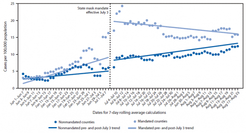 U upravo objavljenoj studiji u MMWR-u analiziran je uticaj nošenja maski na suzbijanje COVID-19 poređenjem okruga u kojima je nošenje maski od 03. jula bilo obavezno (svijetlo plavo) sa onima bez obaveze nošenja (tamno plavo), navedeno je iz Instituta za javno zdravlje.