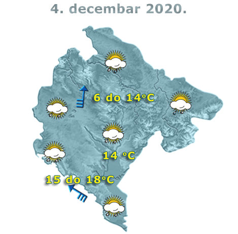 U Crnoj Gori danas će biti umjereno do potpuno oblačno, povremeno i mjestimično sa kišom. Vjetar povremeno umjeren do jak, južni i jugoistočni, a na primorju i istočni. Najviša dnevna temperatura vazduha šest do 18 stepeni, saopšteno je iz Zavoda za hidrometeorologiju.