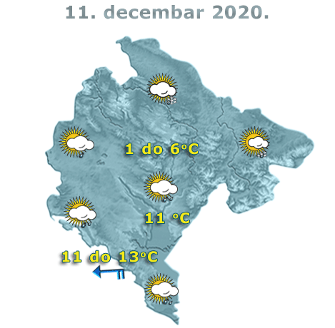U Crnoj Gori danas će biti umjereno do pretežno oblačno, povremeno i mjestimično kiša, ponegdje i kratkotrajan pljusak i grmljavina, uglavnom u južnim i centralnim predjelima. Više uslova za padavine u drugom dijelu dana. Ponegdje, u višim planinskim predjelima, na sjeveru susnježica i snijeg. Vjetar slab do umjeren i promjenljiv, na primorju povremeno umjeren do pojačan, istočnih smjerova. Najviša dnevna temperatura vazduha od jedan do 13 stepeni, saopšteno je iz Zavoda za hidrometeorologiju.