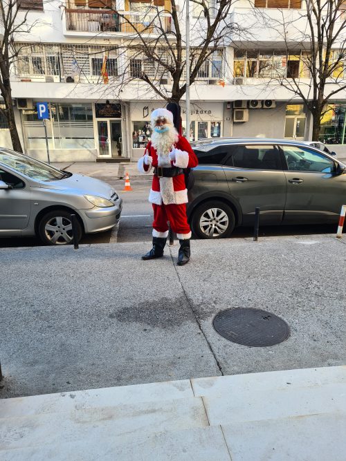 U skladu sa epidemiološkim mjerama, i Djeda Mraz ovoga puta nosi zaštitnu masku, što ga ne sprječava da mami osmijehe i pozitivne reakcije onih najmlađih, ali i starijih Podgoričana.