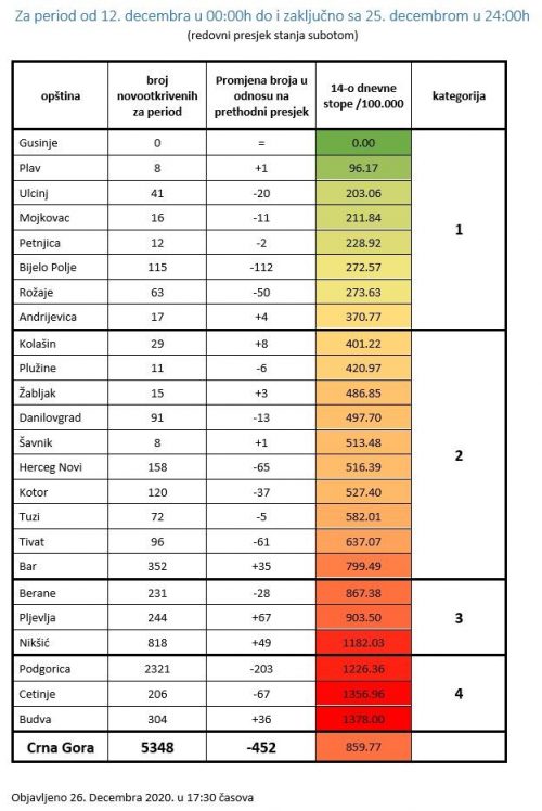 Na osnovu svih registrovanih slučajeva obolijevanja u periodu od subote 12. decembra u 00:00h do i zaključno sa petkom 25. decembrom 2020. u 24:00 h, izračunate su vrijednosti 14-dnevnih opštinskih stopa kumulativne incidencije za navedeni period i sačinjena je lista opština, saopšteno je iz Instituta za javno zdravlje Crne Gore.