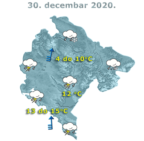U Crnoj Gori danas će biti pretežno oblačno i kišovito, ponegdje pljuskovi i grmljavina. Očekuju se umjerene do obilne kolićine padavina, a lokalno su moguće i bujične poplave. Na sjeveru tokom noći u višim planinskim predjelima susnježica i snijeg. Vjetar južnih smjerova pojačan i jak, ponegdje na udare i veoma jak, krajem dana u slabljenju. Najviša dnevna temperatura vazduha od četiri do 15 stepeni, saopšteno je iz Zavoda za hidrometeorologiju.