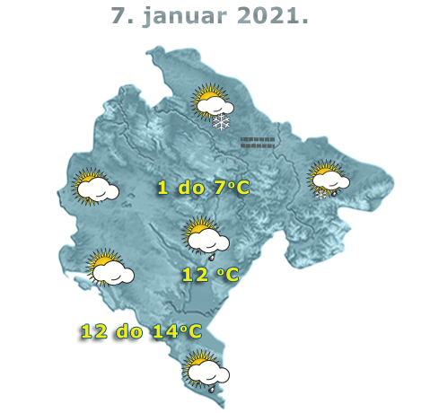 U Crnoj Gori ujutru ili prijepodne i tokom noći biće mjestimično kiša, na sjeveru i u planinskim predjelima susnježica i snijeg, a tokom dana suvo uz umjerenu ili povećanu oblačnost. Vjetar uglavnom slab do umjeren promjenljivog smjera. Najviša dnevna temperatura vazduha od jedan do 15 stepeni, saopšteno je iz Zavoda za hidrometeorologiju.