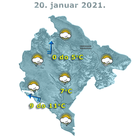 U Crnoj Gori danas će biti umjereno do potpuno oblačno, u drugom dijelu dana i tokom noći, uglavnom u južnim i centralnim predjelima, mjestimično slabe padavine. Ujutru, na sjeveru, po kotlinama magla. Vjetar mjestimično umjeren do pojačan, južnih smjerova. Najviša dnevna temperatura vazduha od nula do 11 stepeni, saopšteno je iz Zavoda za hidrometeorologiju.
