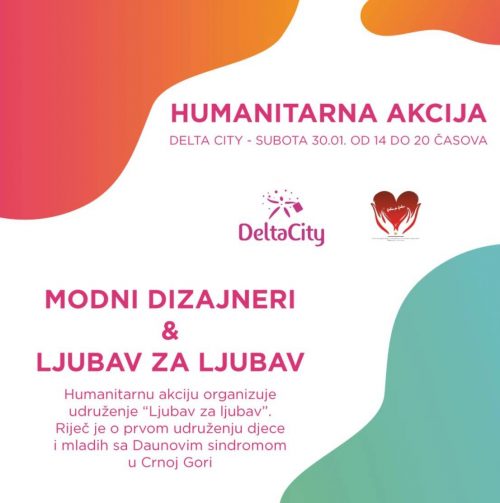 Nevladino udruženje ,,Ljubav za ljubav” 30. januara u terminu od 14 do 20 sati, u tržnom centru Delata City, organizovaće humanitarnu akciju pod nazivom “Modni dizajneri & Ljubav za ljubav” čiji je osnovni cilj prikupljanje sredstava koja će se koristiti za poboljšanje položaja djece i mladih sa Daunovim sindromom u Crnoj Gori.
