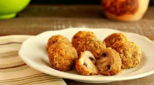 Pečurke očistiti i isjeći na polovine. Svaki dio uvaljati u brašno, jaja, prezle i susam, pa pržiti u ulju dok ne porumeni. Odložiti ih na ubrusu, da se ukloni višak masnoće. Za pripremu sosa potrebno je sitno isjeći kisjele krastavčiće, dodati majonez, pavlaku i ren i sve promiješati.