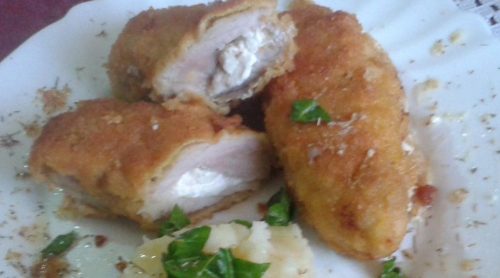 4. Zatvoriti šnicle i pričvrstiti ih čačkalicama. Staviti ih jednom stranom u brašno i pržiti na vrelom ulju.