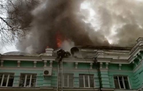 Krov bolnice u ruskom gradu Blagovješčensku zahvatila je vatra kada je kratki spoj izazvao požar koji se brzo proširio preko starih drvenih greda.