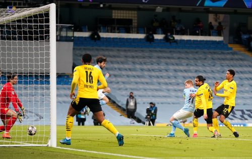 Mančester Siti pobijedio je večeras u prvom meču četvrtfinala Lige šampiona Borusiju Dortmund 2:1 na stadionu ,,Etihad” u Mančesteru. Golove su postigli De Brujne u 19. i Foden u 90. minutu za Siti, a Rojs u 84. za Borusiju.