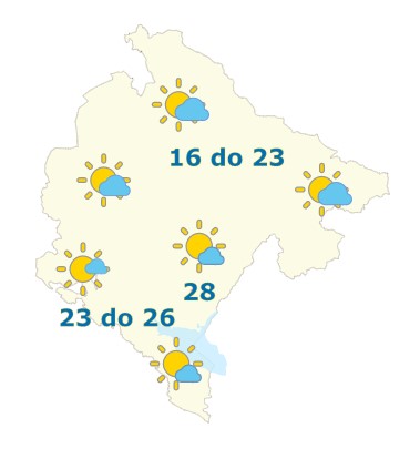 Danas će u Crnoj Gori biti pretežno sunčano ili malo do umjereno oblačno. Vjetar slab do umjeren, ponegdje kratkotrajno pojačan, sjevernih smjerova. Najviša dnevna temperatura vazduha od 16 do 28 stepeni, saopšteno je iz Zavoda za hidrometeorologiju.