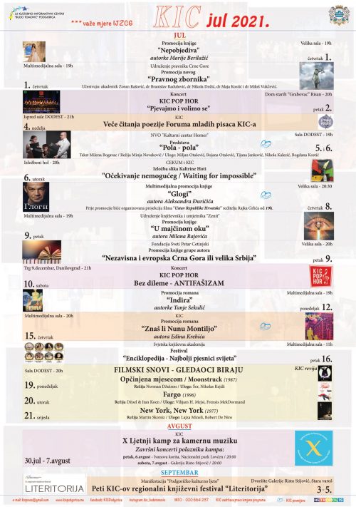 Ljubitelji umjetnosti i kulturnih dešavanja uživaće i tokom jula mjeseca u programima koje će Kulturno – informativni centar „Budo Tomović“ prirediti po važećim preporukama Instituta za javno zdravlje Crne Gore i Komisije za zaštitu stanovništva. U KIC-u će biti priređeno niz promocija aktuelnih književnih izdanja, likovnih prezentacija, filmskih projekcija, a planirana je pozorišna premijera, saopšteno je iz PR Službe KIC-a ,,Budo Tomović”.