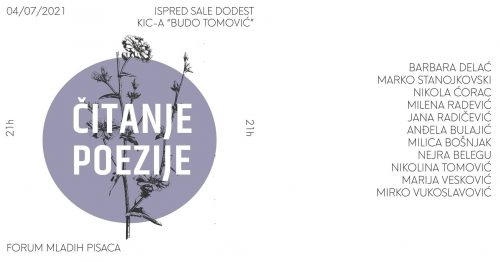 Forum mladih pisaca KIC-a 4. jula organizovaće čitanje poezije u bašti ispred DODEST-a, a svoju poeziju govoriće: Nikola Ćorac, Milena Radević, Marko Stanojkovski, Barbara Delać, Nejra Belegu, Jana Radičević, Milica Bošnjak, Anđela Bulajić, Nikolina Tomović, Marija Vesković i Mirko Vukoslavović. Pjesnicima Foruma moći će da se pridruži i publika čitanjem svojih ili stihova omiljenih pjesnika.