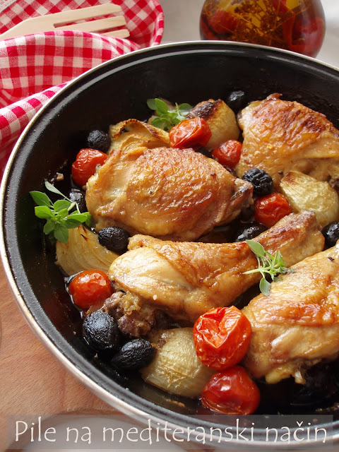 Sastojci: 1 manje pile (mogu i samo bataci sa karabatacima), 1 crni luk, 2-3 češnja bijelog luka, 100 g maslina, nekoliko koktel paradajza, 2 dl pilećeg bujona, sok od 1/2 limuna, so, biber, svjež bosiljak