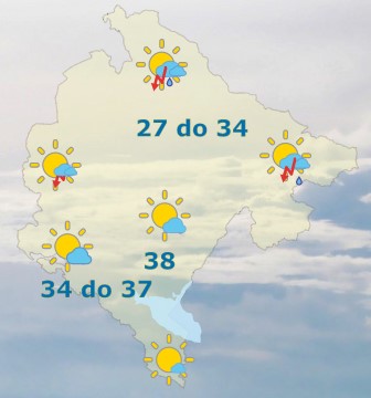 Danas će u Crnoj Gori u južnim i centralnim predjelima biti pretežno sunčano i veoma toplo. U popodnevnim satima, uz umjeren razvoj oblačnosti uslovi za tek ponegdje kratkotrajnu kišu ili pljusak i grmljavinu, prvenstveno u planinskim oblastima. Na sjeveru promjenljivo oblačno sa sunčanim intervalima, ali ponegdje i kiša ili pljusak i grmljavina. Više uslova za padavine od sredine dana. Vjetar slab do umjeren, promjenljivog smjera, krajem dana i tokom noći mjestimično umjeren do pojačan, sjeverni i sjeveroistočni. Najviša dnevna temperatura vazduha od 27 do 39 stepeni.