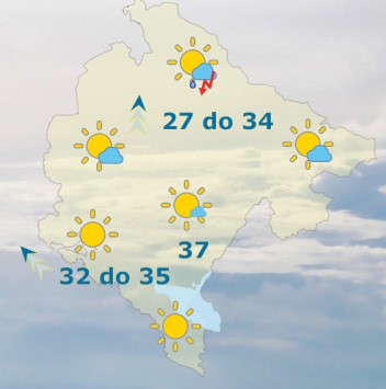 Danas će u Crnoj Gori biti pretežno sunčano i veoma toplo, uz slab do umjeren razvoj oblačnosti. U popodnevnim satima, prvenstveno u planinskim predjelima na sjeveru, ponegdje kratkotrajno kiša ili pljusak i grmljavina. Vjetar slab do umjeren, ponegdje u sjevernim predjelima i na primorju pojačan, južnih smjerova. Najviša dnevna temperatura vazduha od 27 do 38 stepeni, saopšteno je iz Zavoda za hidrometeorologiju.