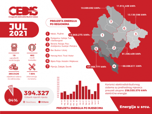 Korisnici elektrodistributivnog sistema su u julu preuzeli ukupno 258.555.570 kWh električne energije, što je 20 odsto više u odnosu na isti period prethodne godine. Najviše električne energije, oko 35 odsto, distribuirano je korisnicima na području Podgorice, Danilovgrada, Tuzi i Cetinja (Region 2), saopšteno je iz CEDIS-a.