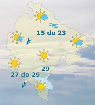 Danas će u južnim i centralnim predjelima Crne Gore biti pretežno sunčano. Na sjeveru, umjereno do pretežno oblačno, poslijepodne smanjenje oblačnosti. Vjetar mjestimično umjeren do jak, sjevernih smjerova. Najviša dnevna temperatura vazduha 15 do 29 stepeni, saopšteno je iz Zavoda za hidrometeorologiju.