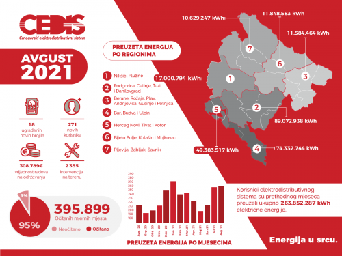 Korisnici elektrodistributivnog sistema su u avgustu preuzeli ukupno 263.852.287 kWh električne energije, što je za 25 odsto više u odnosu na isti period prethodne godine. Najviše električne energije, oko 34 odsto, distribuirano je korisnicima na području Podgorice, Danilovgrada i Cetinja (Region 2), saopšteno je iz Službe za korporativne komunikacije CEDIS-a.