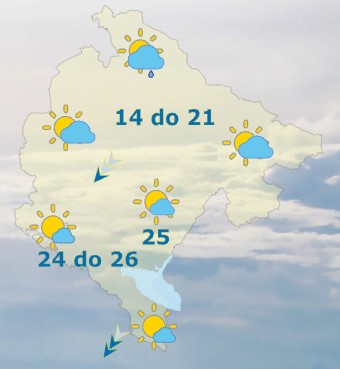 U južnim i centralnim predjelima sunčano, uz slab do umjeren razvoj dnevne oblačnosti. Na sjeveru, veći dio dana umjerena do povećana oblačnost, ali uglavnom bez kiše. Vjetar prijepodne, mjestimično umjeren do pojačan sjeveroistočni, zatim slab promjenljivog smjera. Najviša dnevna temperatura vazduha od 14 do 26 stepeni.