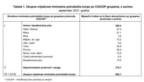 Ukupna vrijednost minimalne potrošačke korpe za septembar iznosila je 665,10 eura, od čega su izdaci za hranu i bezalkoholna pića bili 289,40 eura, a izdaci za neprehrambene proizvode i usluge 375,70 eura, saopšteno je iz Uprave za statistiku MONSTAT.