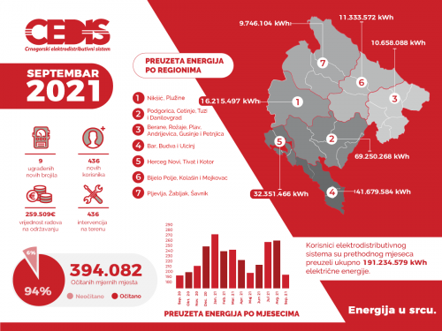 Korisnici elektrodistributivnog sistema su u septembru preuzeli ukupno 191.234.579 kWh električne energije, što je 27% manje u odnosu na avgustovsku potrošnju. Najviše električne energije, oko 36 odsto, distribuirano je korisnicima na području Podgorice, Danilovgrada i Cetinja (Region 2), saopšteno je iz CEDIS-a.