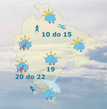 Danas će u Crnoj Gori biti naoblačenje sa kišom, mjestimično pljuskovi i grmljavina, prijepodne u jugozapadnim i zapadnim, a poslijepodne ili tokom noći i u ostalim predjelima. Vjetar mjestimično umjeren do pojačan, južni i jugoistočni. Najviša dnevna temperatura vazduha od 11 do 22 stepena, saopšteno je iz Zavoda za hidrometeoroliju,