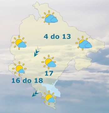 Danas će u Crnoj Gori u južnim i centralnim predjelima biti malo do umjereno oblačno, sa dužim sunčanim intervalima. Na sjeveru umjereno do pretežno oblačno, a tokom prijepodneva po kotlinama magla. Vjetar mjestimično umjeren do jak, sjeverni i sjeveroistočni. Najviša dnevna temperatura vazduha od 4 do 18 stepeni, saopšteno je iz Zavoda za hidrometeorologiju.
