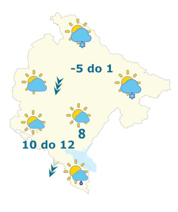 Danas će na jugu, uglavnom u jutarnjim, a u sjevernim i istočnim predjelima tokom prijepodneva, biti prestanak padavina, u južnim i centralnim predjelima djelimično ili potpuno razvedravanje, dok će se na sjeveru tokom većeg dijela dana zadražati pretežno oblačno. Vjetar umjeren do jak, na udare veoma jak, ponegdje i olujne jačine, sjeverni i sjeveroistočni, od sredine dana će slabiti, a tokom noći skrenuti na južni smjer. Najviša dnevna temperatura vazduha od -5 do 12 stepeni, saopšteno je iz Zavoda za hidrometeorologiju.