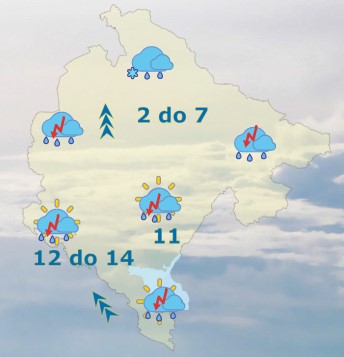 Danas će u Crnoj Gori biti pretežno oblačno sa kišom, mjestimično pljuskovi i grmljavina. Na sjeveru, u višim planinskim predjelima, moguć snijeg i susnježica, prvenstveno u jutarnjim i noćnim satima. Mjestimično se očekuju umjerene do obilne kolčine padavina. Vjetar umjeren do jak, na udare i veoma jak, ponegdje i olujne jačine, južnih smjerova, tokom popodneva će slabiti. Najviša dnevna temperatura vazduha od 3 do 15 stepeni, saopšteno je iz Zavoda za hidrometeorologiju.