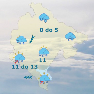 Danas će u Crnoj Gori biti pretežno oblačno sa kišom, mjestimično pljuskovima i grmljavinom, na sjeveru tokom većeg dijela dana sa susnježicom i snijegom, koji će se tokom noći proširiti na planine, centralnih i južnih predjela. Vjetar slab do umjeren na primorju i pojačan istočnih smjerova, krajem dana ili u večernjim satima, u cijeloj zemlji pojačan i jak sjeverni. Najviša dnevna temperatura vazduha od 0 do 13 stepeni, saopšteno je iz Zavoda za hidrometeorologiju.