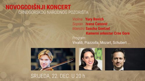 Crnogorsko narodno pozorište nastavlja tradiciju organizovanja novogodišnjeg koncerta. Na Novogodišnjem koncertu 22. decembra nastupiće slavni violinista Yury Revich i sopran Ivana Čanović. Publici će biti predstavljen novi Kamerni orkestar Crne Gore, sastavljen od najboljih muzičara iz naše države i regiona a dirigent je Sascha Goetzel. Publika će biti u prilici da uživa u poznatim melodijama simfonijske muzike, valcera, tanga, tradicionalnih i savremenih kompozicija za violinu i operske muzike (Vivaldi, Piazzolla, Mozart, Schubert…), saopšteno je iz PR službe CNP-a.