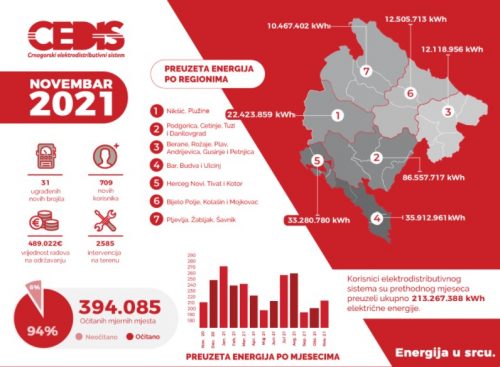 Korisnici elektrodistributivnog sistema su u novembru preuzeli ukupno 213.267.388 kWh električne energije, što je na nivou ostvarene potrošnje tokom istog perioda prethodne godine. Najviše električne energije, oko 40 odsto, distribuirano je korisnicima na području Podgorice, Danilovgrada i Cetinja (Region 2), saopšteno je iz PR službe CEDIS-a.